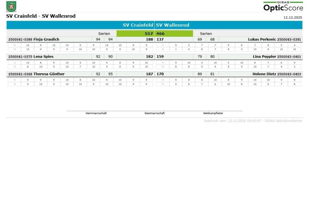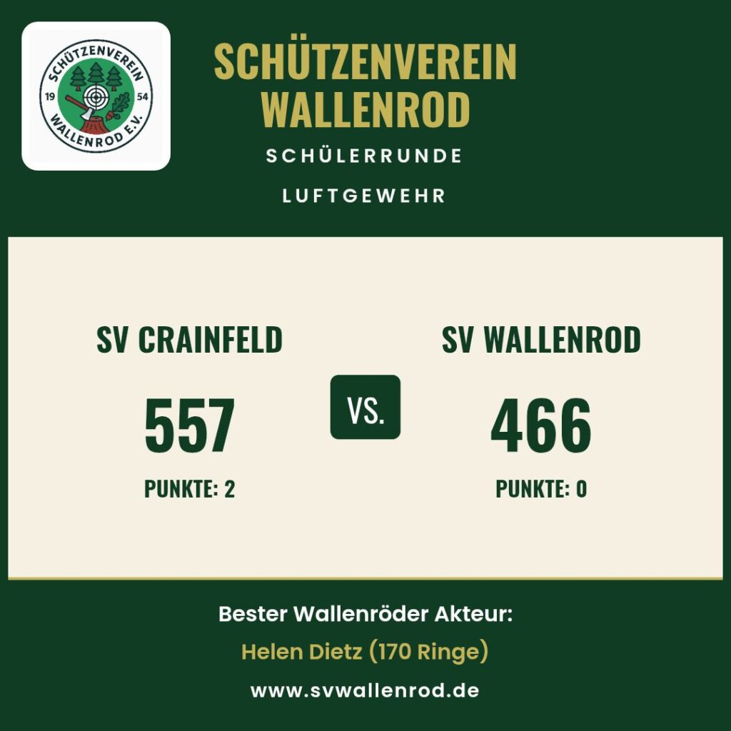 Im jüngsten Schülerwettkampf musste sich die Mannschaft des SV Wallenrod dem SV Crainfeld geschlagen geben. Obwohl Crainfeld mit insgesamt 557 Ringen erwartungsgemäß eine Nummer zu stark war, zeigten die jungen Schützen des Wallenröder Teams eine engagierte Leistung und konnten einen besonderen Erfolg verbuchen.
