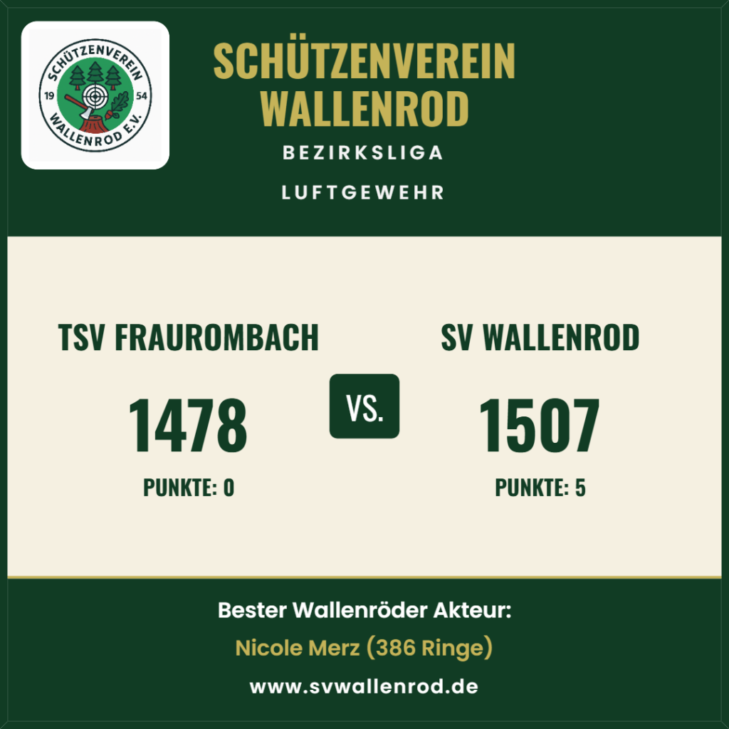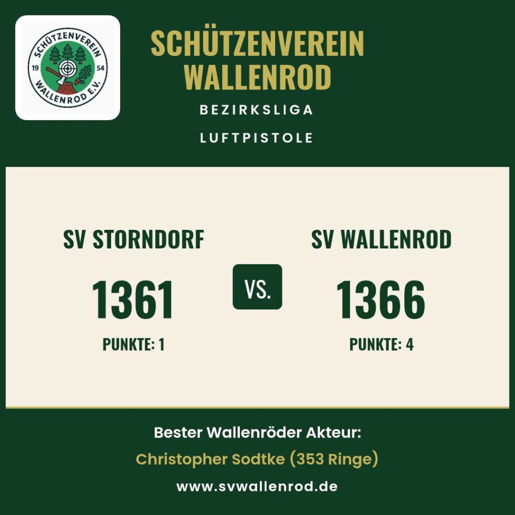 Erfolgreicher Wettkampfabend für unsere erste Luftpistolen-Mannschaft: Im Duell gegen den SV Storndorf 1 behielten unsere Schützen die Nerven und sicherten sich einen verdienten 4:1-Erfolg. Mit einer geschlossenen Mannschaftsleistung von insgesamt 1366 Ringen wandern beide Mannschaftspunkte auf das Konto des SV Wallenrod.