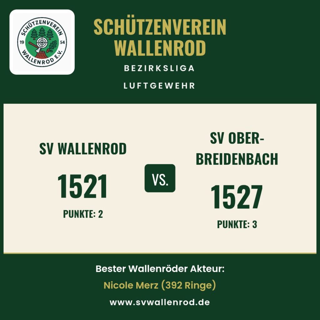 Während Nicole Merz mit einer herausragenden Leistung von 392 Ringen und Svenja Schött mit 383 Ringen ihre Einzelpunkte für Wallenrod sichern konnten, gingen die weiteren Duelle und der Punkt für das Gesamtergebnis an die Gäste aus Ober Breidenbach.