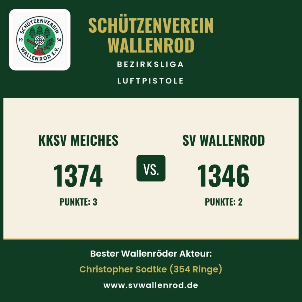 Der Wettkampf war bis zum Schluss hart umkämpft. Besonders dramatisch gestaltete sich das Duell an Position 4: Carolin Perkovic bewies nach einem Gleichstand im Hauptprogramm extrem starke Nerven. Im entscheidenden Stechen setzte sie sich mit 83 zu 81 Ringen durch und sicherte Wallenrod damit einen wichtigen Einzelpunkt. Auch Bernd Müller zeigte eine starke Leistung und konnte sein Duell souverän für sich entscheiden.