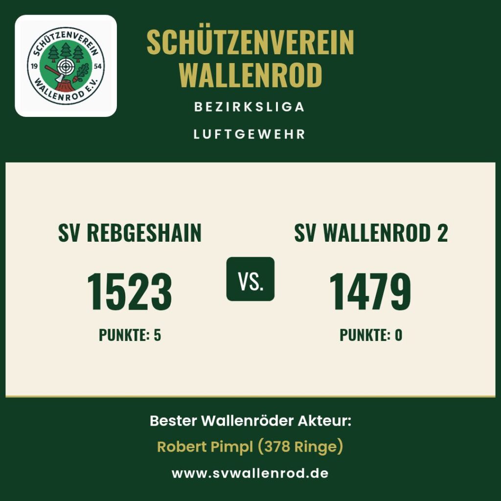 Im Auswärtskampf der Bezirksliga Luftgewehr musste unsere zweite Mannschaft eine klare Niederlage gegen den SV Rebgeshain 1 hinnehmen. Der Wettkampf endete aus Sicht des SV Wallenrod 2 mit einem 0:5 in den Einzelduellen.