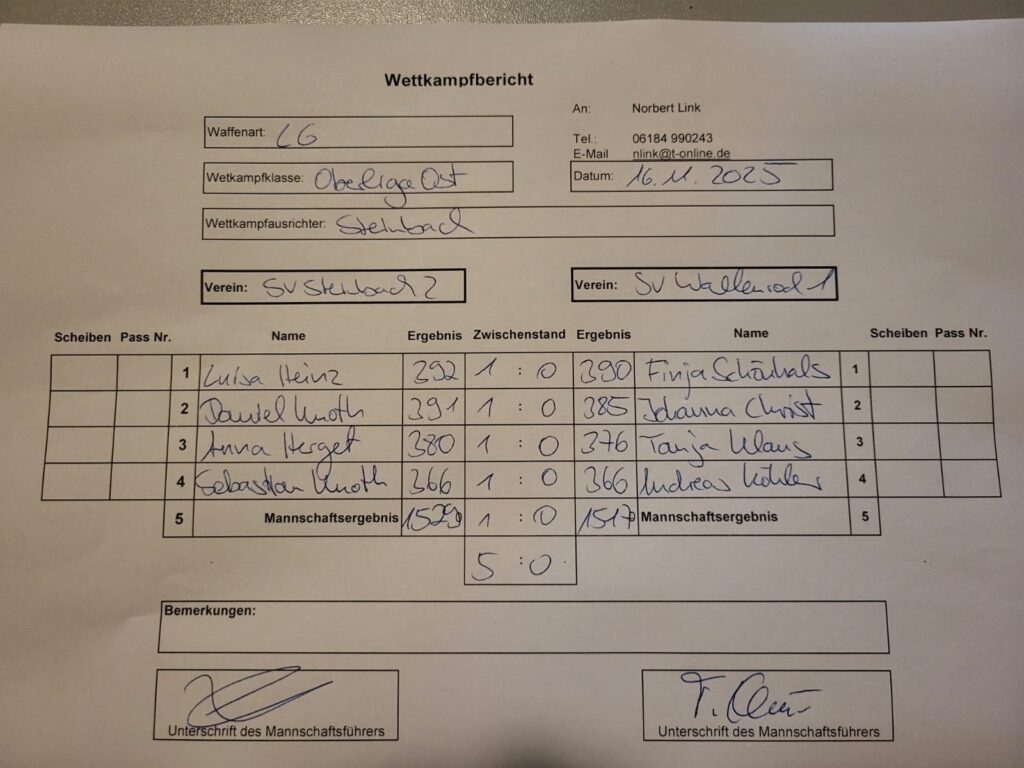 Am diesem Sonntag, den 16. November 2025, war unsere erste Luftgewehrmannschaft zu Gast beim SV Steinbach II. In einem insgesamt ausgeglichenen Wettkampf musste sich Wallenrod am Ende mit 0 : 5 geschlagen geben. Die Gastgeber erzielten 1529 Ringe, unser Team kam auf 1517 Ringe.